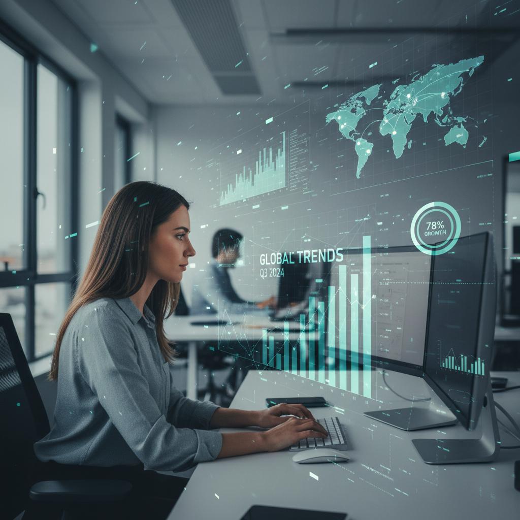 Alt text: Professional photo of data analyst at work with digital overlays showing workflow automation.
