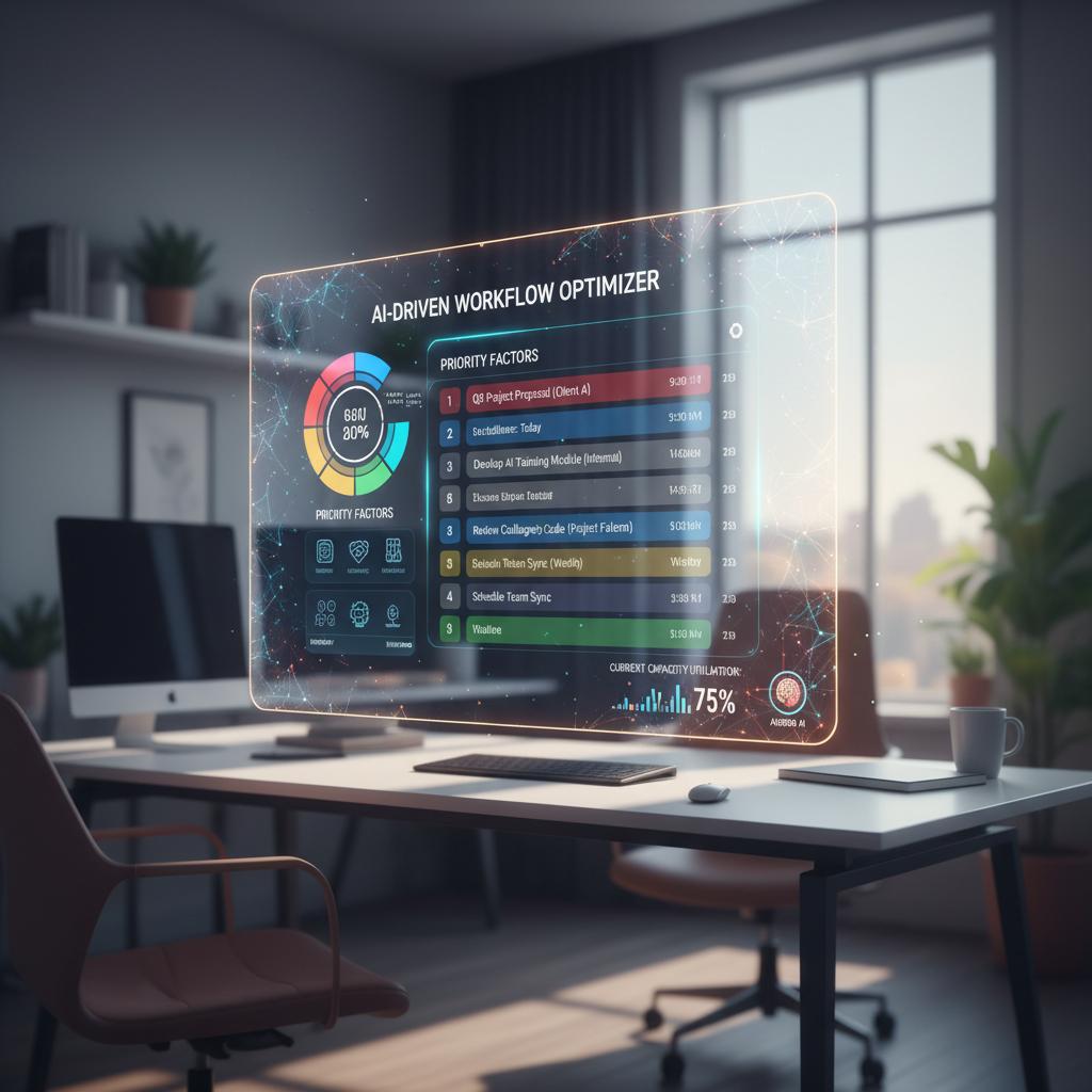 Descriptive alt text: AI interface highlighting workflow bottlenecks in a modern office, showing how task prioritization is optimized