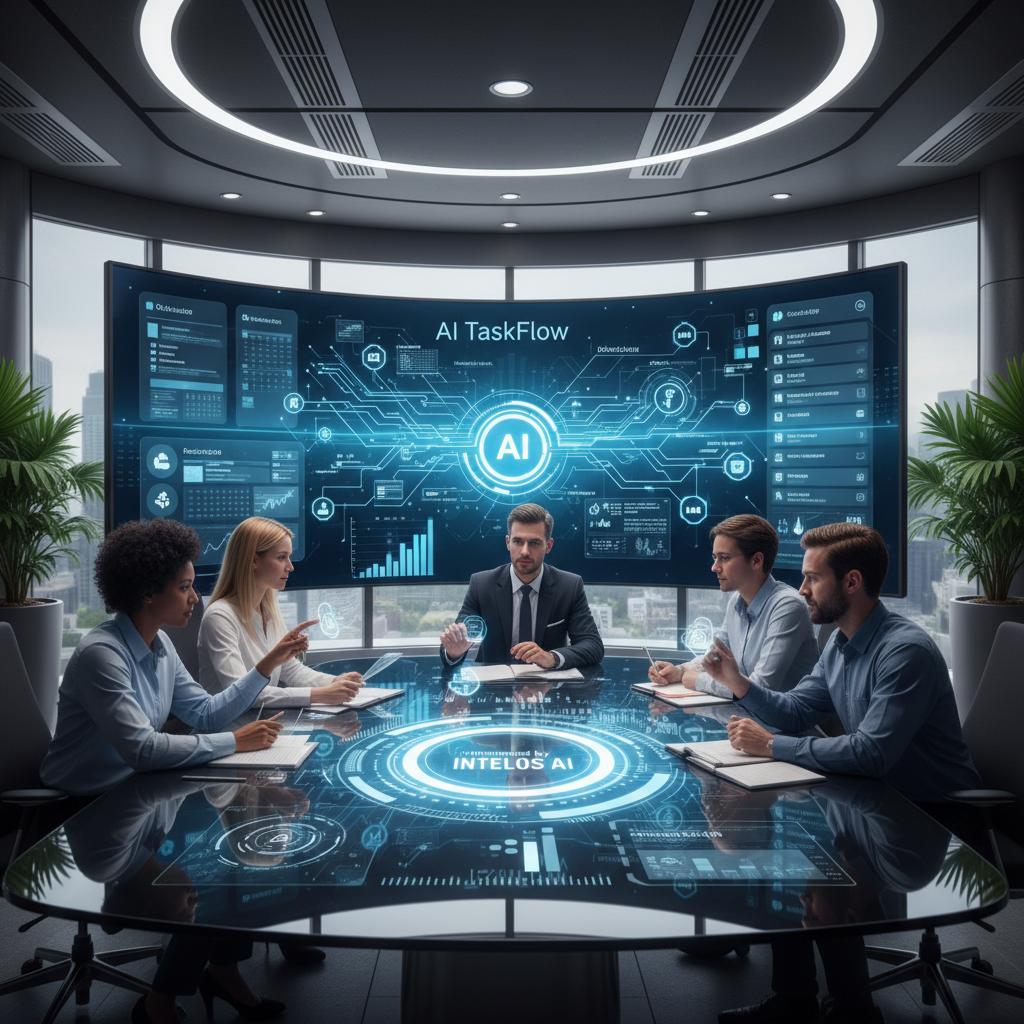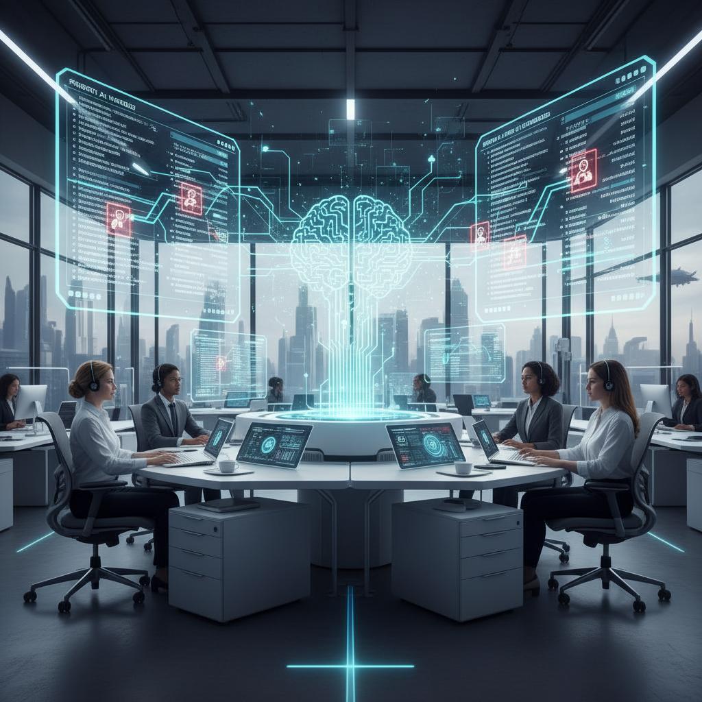 Descriptive alt text: Futuristic office filled with AI interfaces and digital task flows, illustrating trends in ai-driven task prioritization