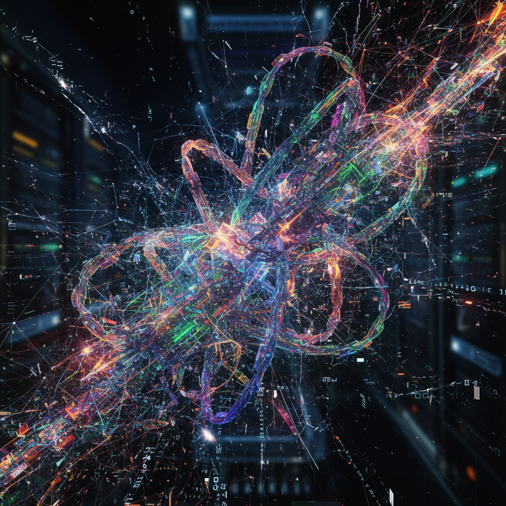 Alt text: Abstract photo depicting AI algorithms tangled in chaotic, corrupted data streams, representing challenges in data quality for automated customer experience tracking.