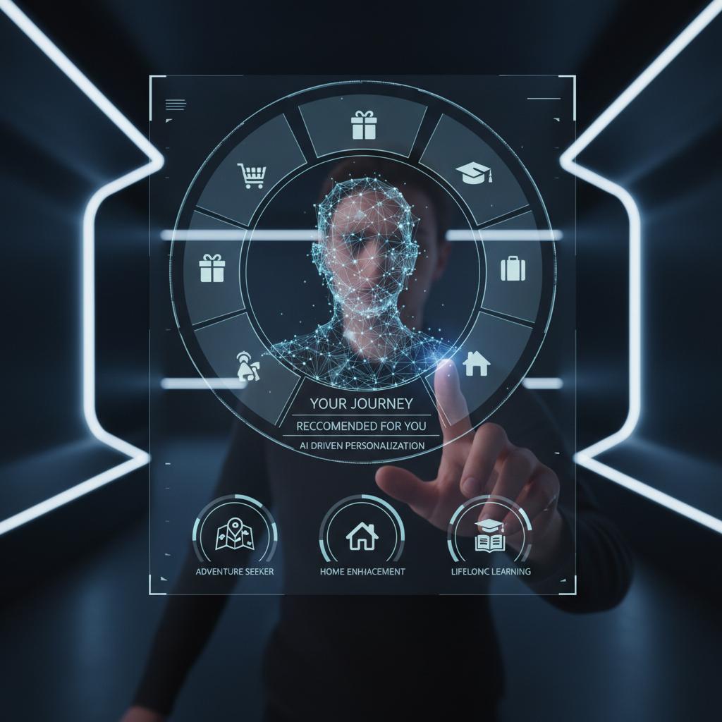 Alt text: Futuristic interface showing hyper-personalized AI-driven customer experiences with vibrant, optimistic design.