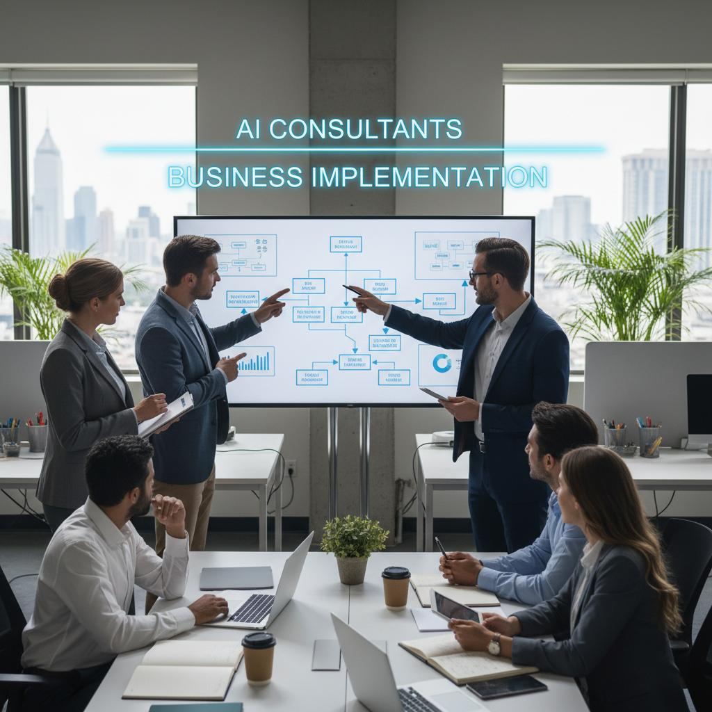 Alt text: AI consultants advising support team during a business implementation meeting.