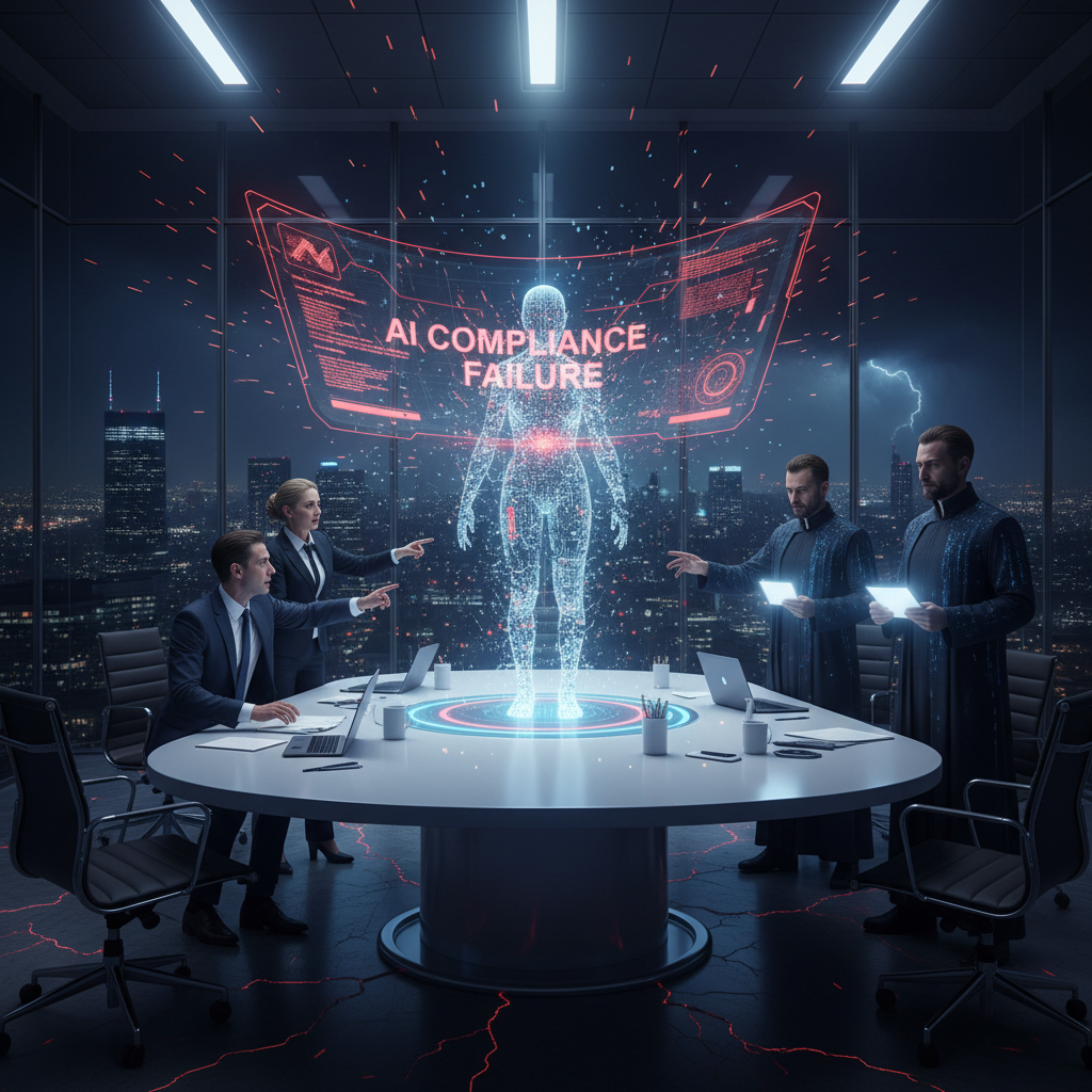 Alt text: Regulators confront executives in a tense office setting over ai-powered compliance monitoring failures, highlighting accountability issues.