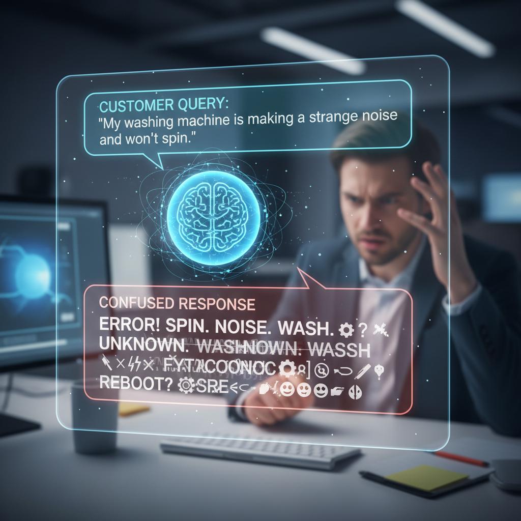AI chatbot interface displaying a confused, inaccurate response to a complex question, highlighting the technology’s limits in real-world customer service.