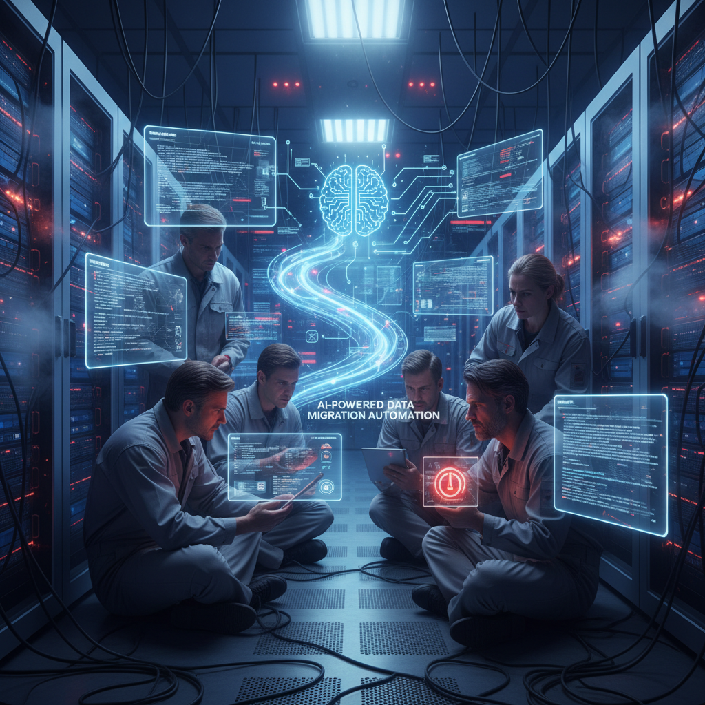 Engineers under pressure during a high-stakes ai-powered data migration automation in a server room