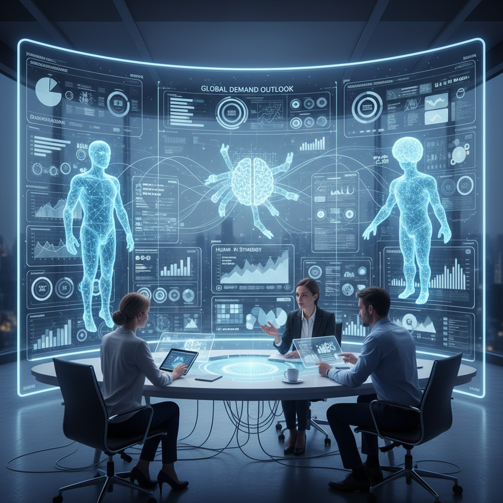 AI-driven demand forecasting in a modern office, professionals collaborating at transparent screens with live demand data.