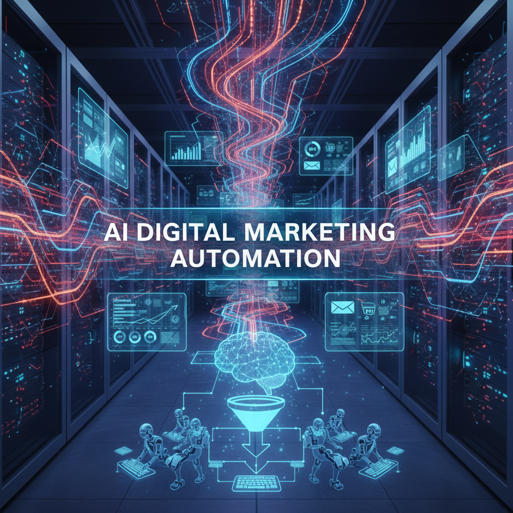 Alt text: AI-powered servers and glowing data lines visualizing the backbone of digital marketing automation.