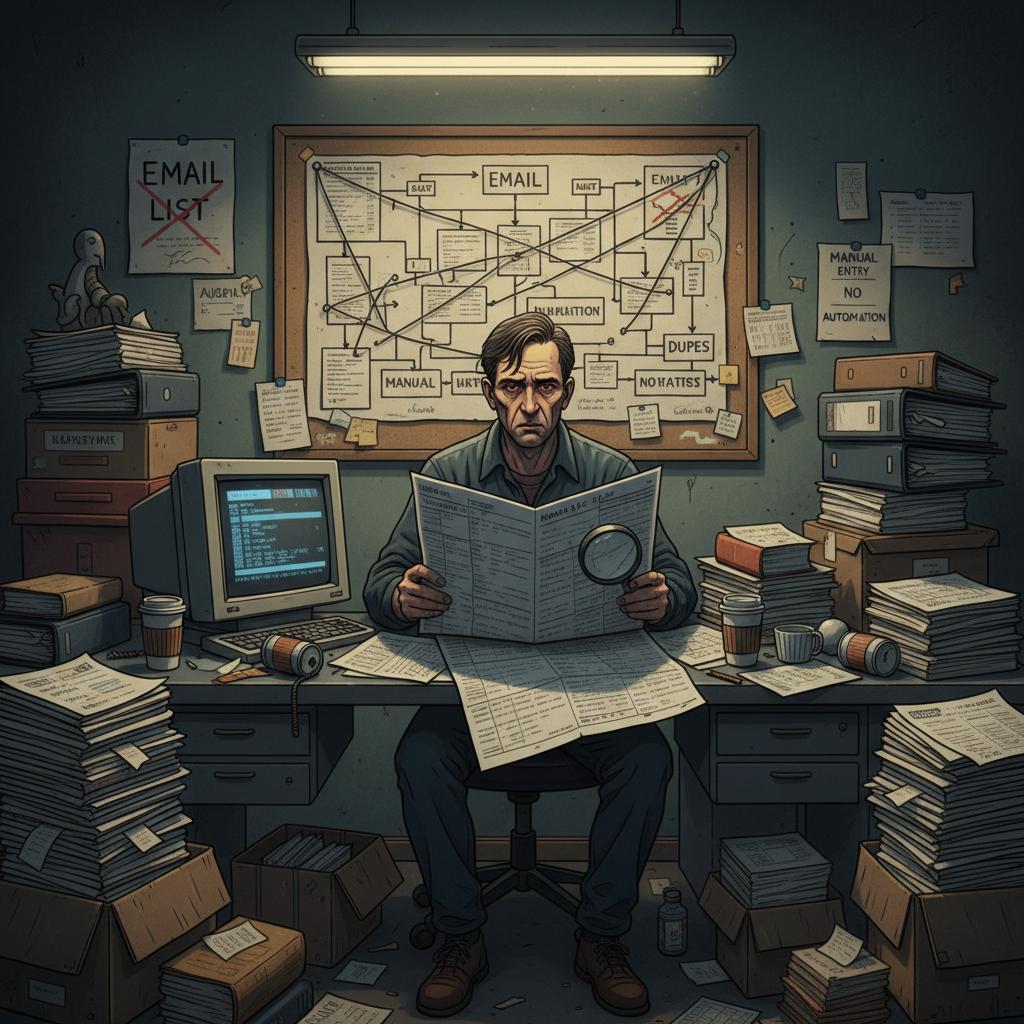 Alt text: Overworked marketer overwhelmed by outdated email list management in a dim office with paper spreadsheets.
