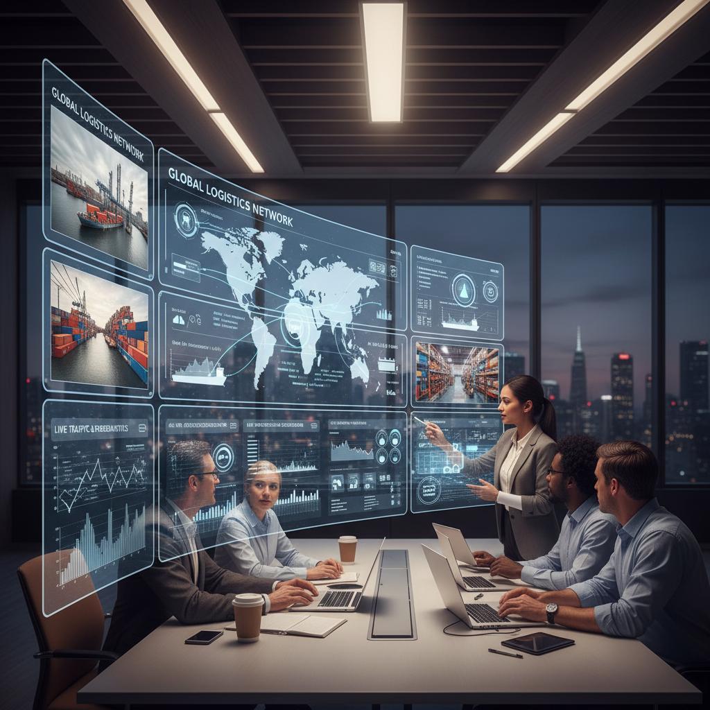 Vibrant photo of a logistics team collaborating around AI dashboards, highlighting how human intelligence and real-time analytics drive success.