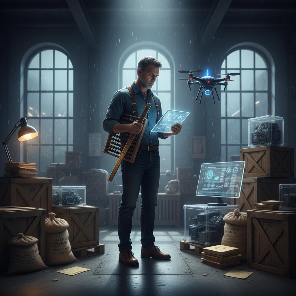 Moody, introspective photo of a logistics worker caught between the nostalgia of old tools and the promise (or threat) of new technology.