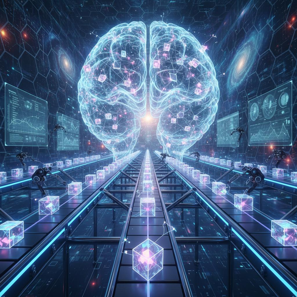 A futuristic photo visualizing the interplay of neural networks and conveyor belt logistics, symbolizing the data-driven core of modern automation.