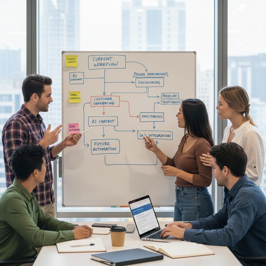 Alt text: Small business team conducting automation planning session, mapping workflows and automation opportunities.