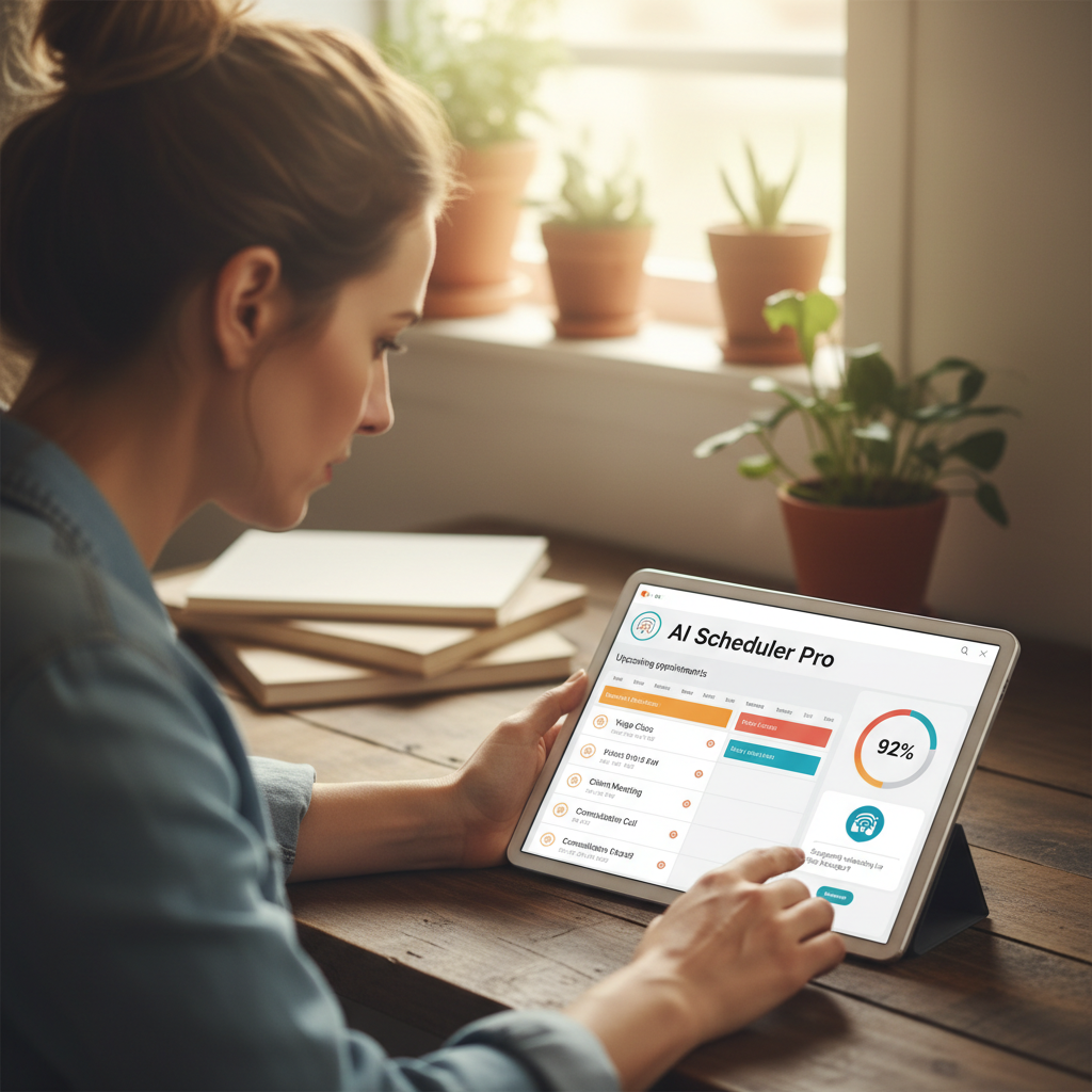Photo of a small business owner happily monitoring appointments on an AI-powered scheduling dashboard, illustrating the real-world benefits of automation for small enterprises.