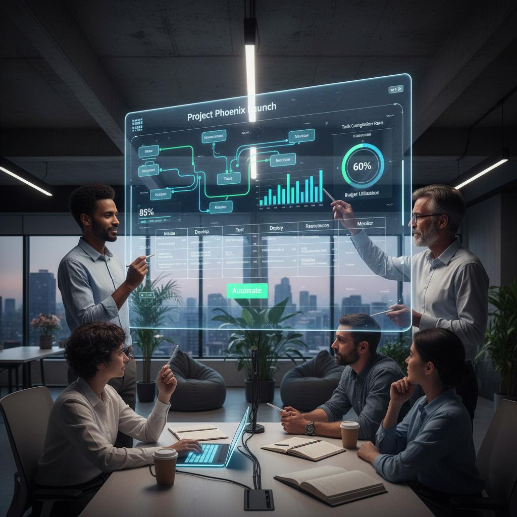 Alt: Business leaders collaborating with an AI interface, planning the next steps for automating project workflows