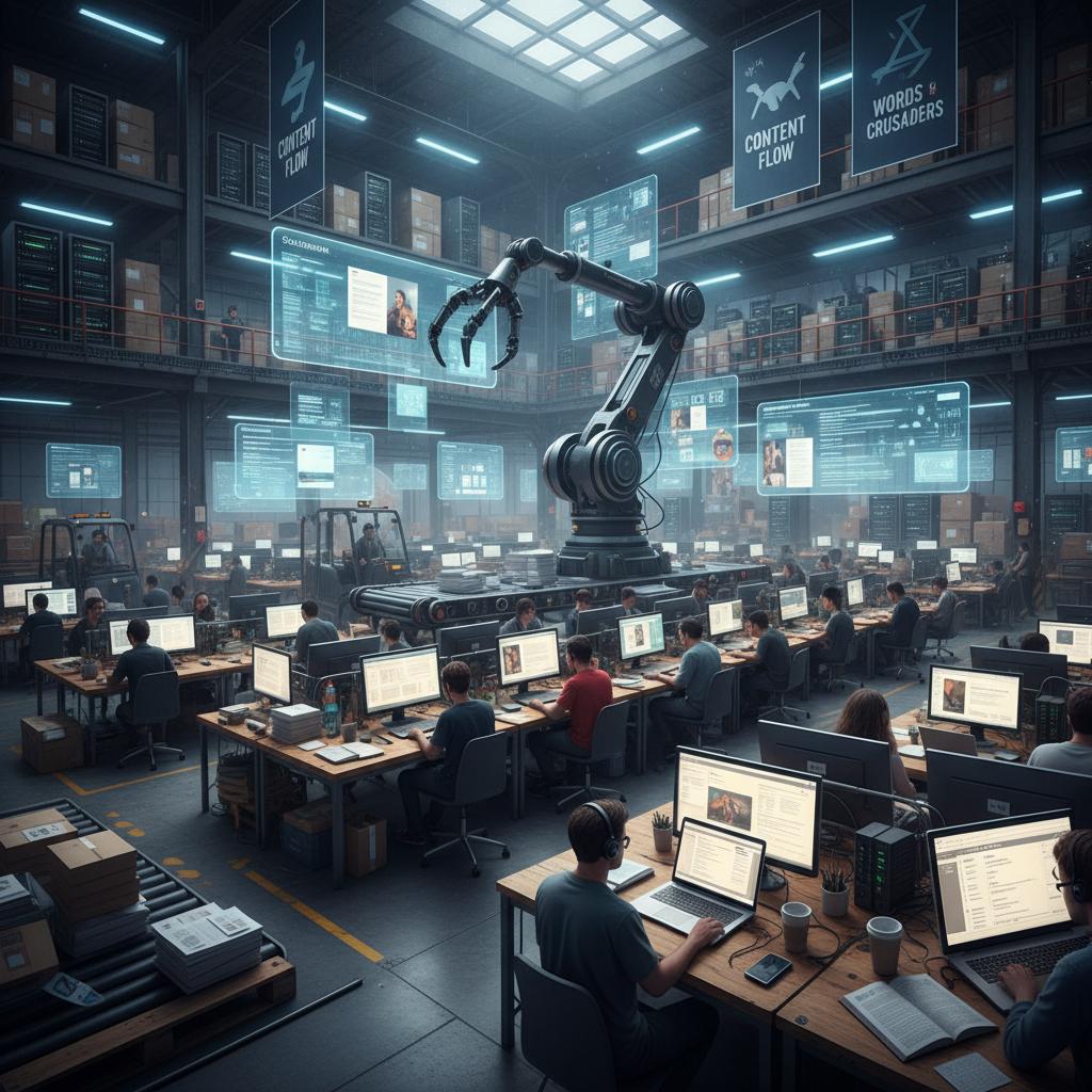 A high-volume, low-cost operation employing large numbers of writers to churn out SEO-oriented articles and product descriptions with minimal editorial oversight.