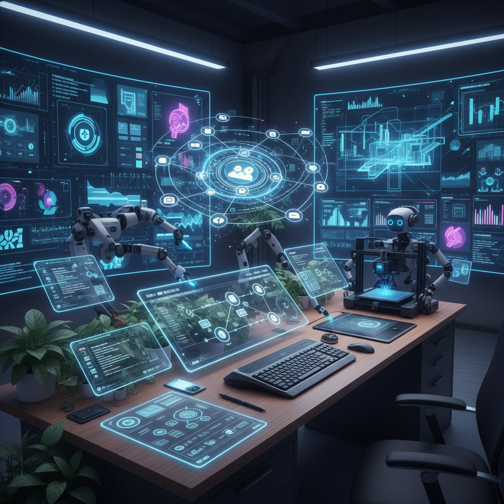 Alt text: AI-driven office of the future with digital assistants and transparent screens, illustrating advanced task automation