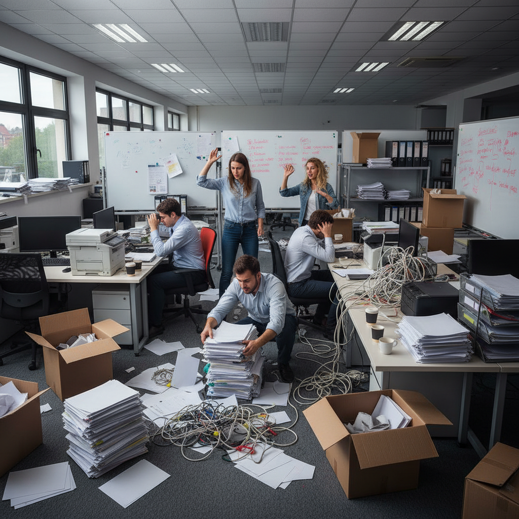 Alt text: Manual work chaos in a modern office with paperwork and stressed workers