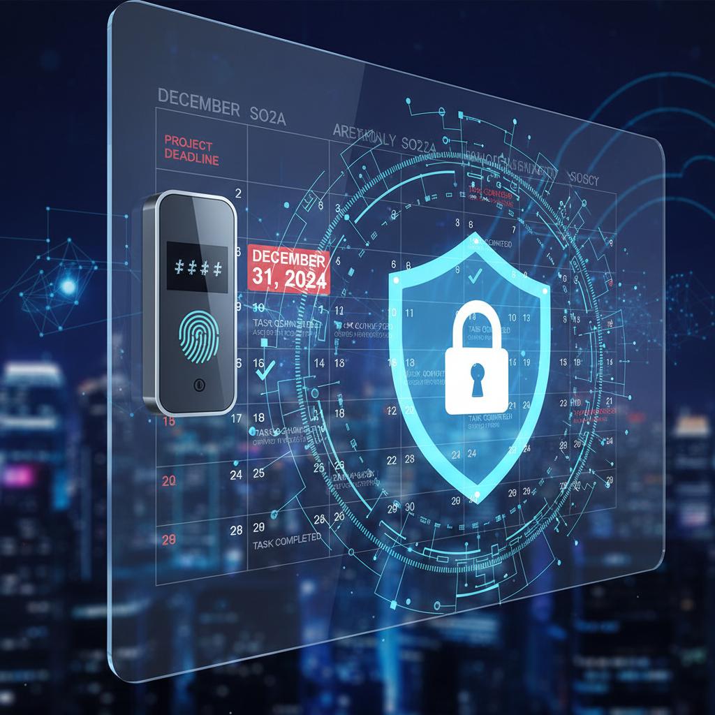 A digital lock superimposed on a deadline calendar—visual shorthand for the privacy and security dilemmas of cloud-based automation.