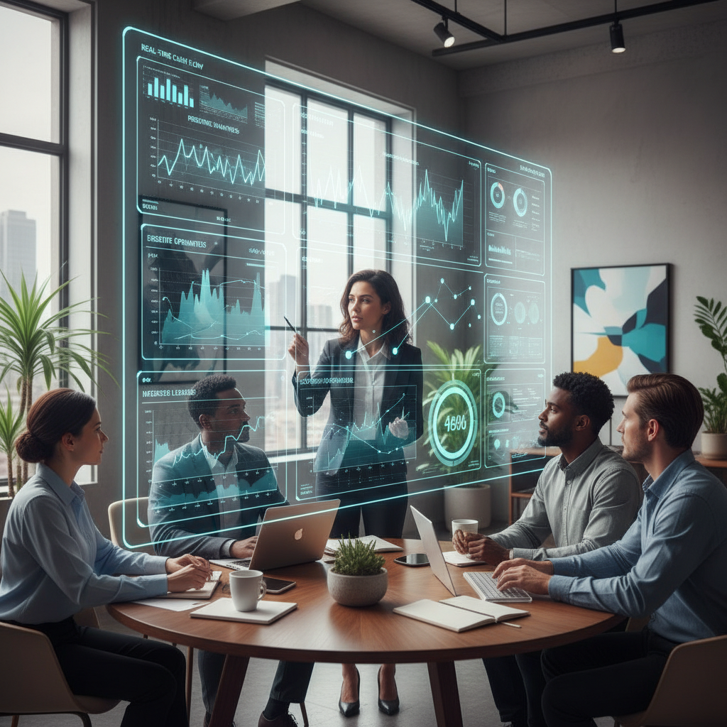 Finance professionals collaborating with an AI dashboard—a visual metaphor for the changing face of finance work.