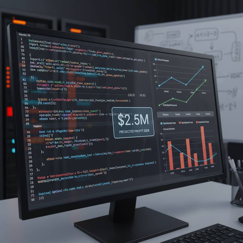 Image: Code snippets and budget charts overlaid in a dim-lit workspace (Alt text: Machine learning code generating budget forecasts)