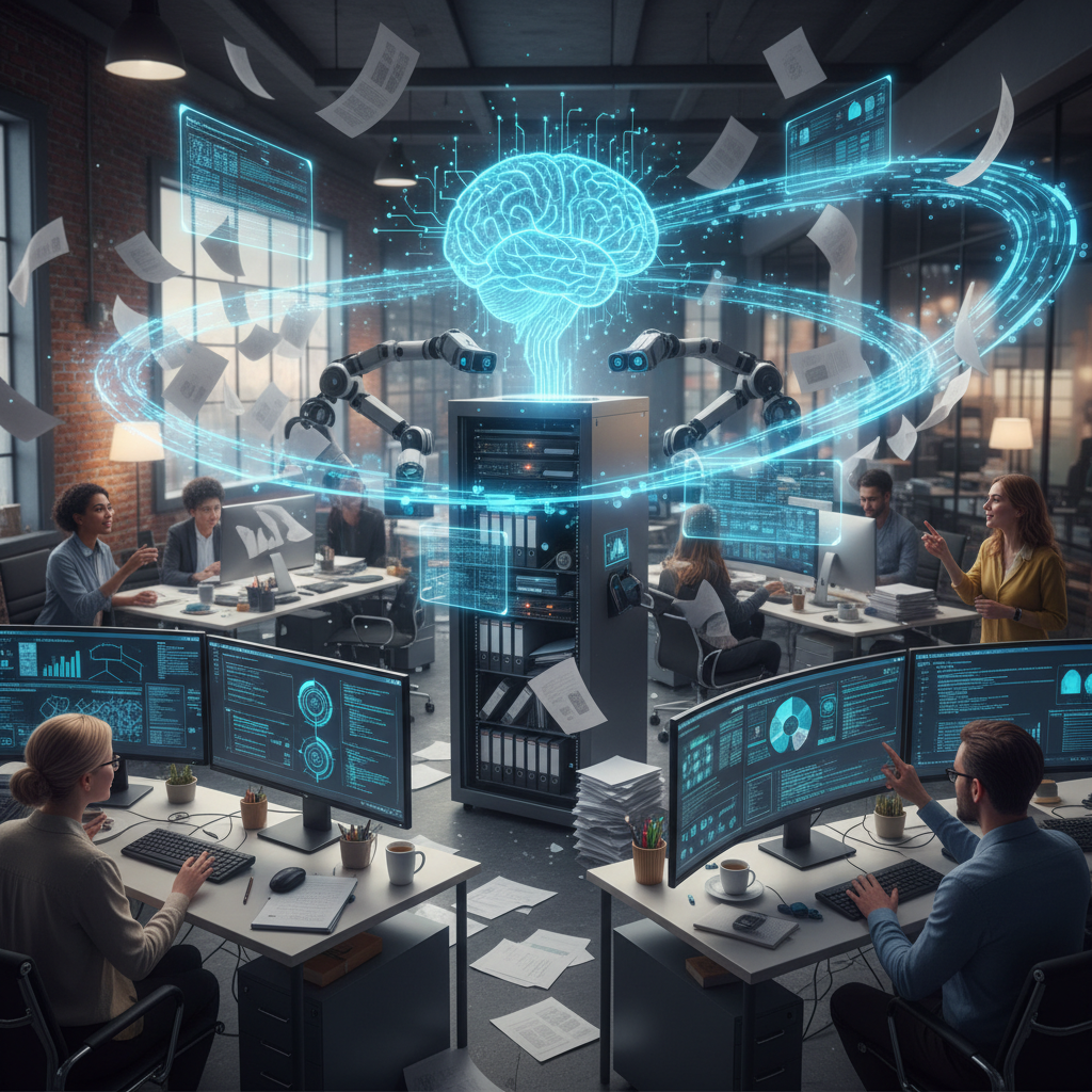 AI automating paperwork in a chaotic office environment, highlighting workflow automation and digital labor efficiency.