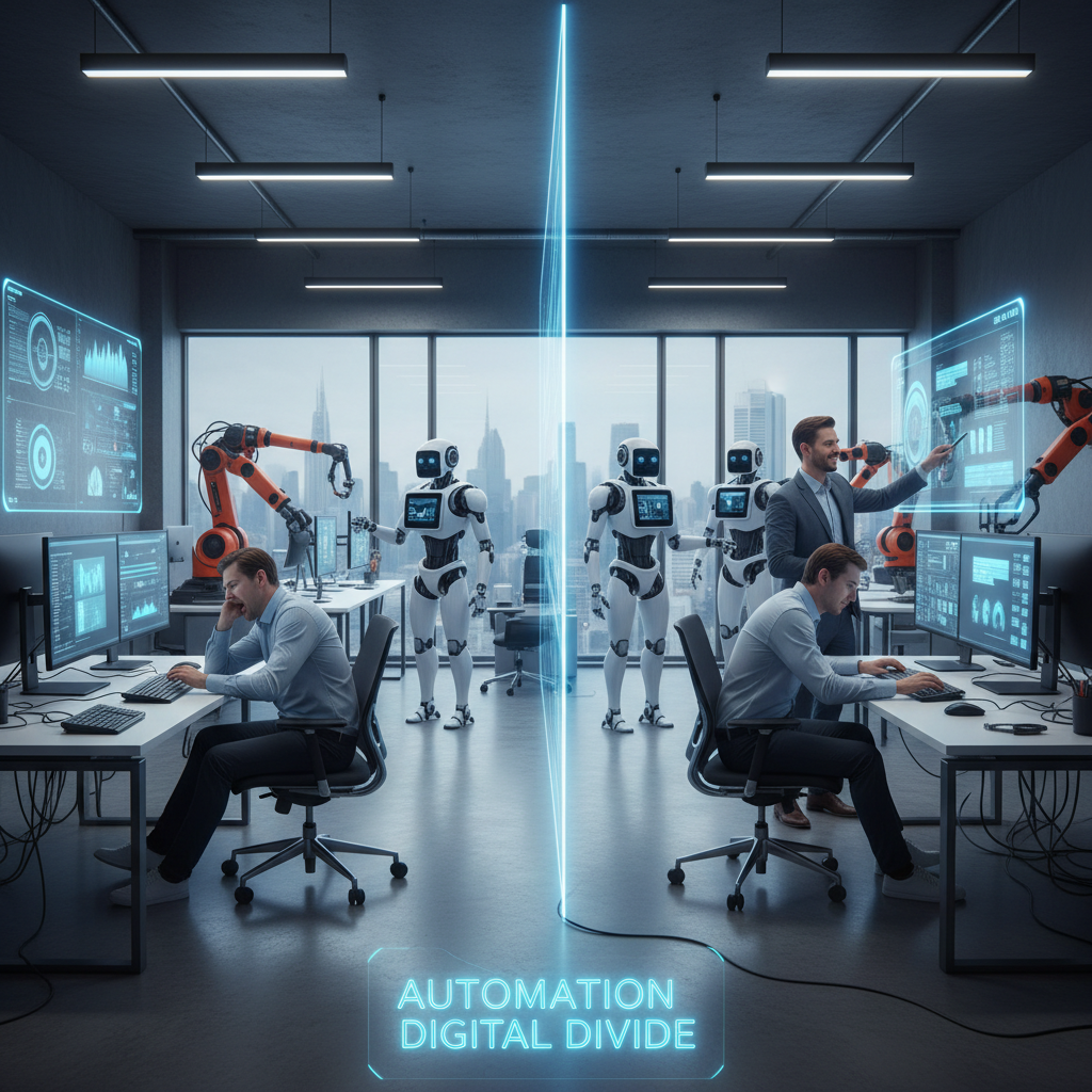 Disengaged workers left behind by automation, illustrating the growing digital divide in modern offices.