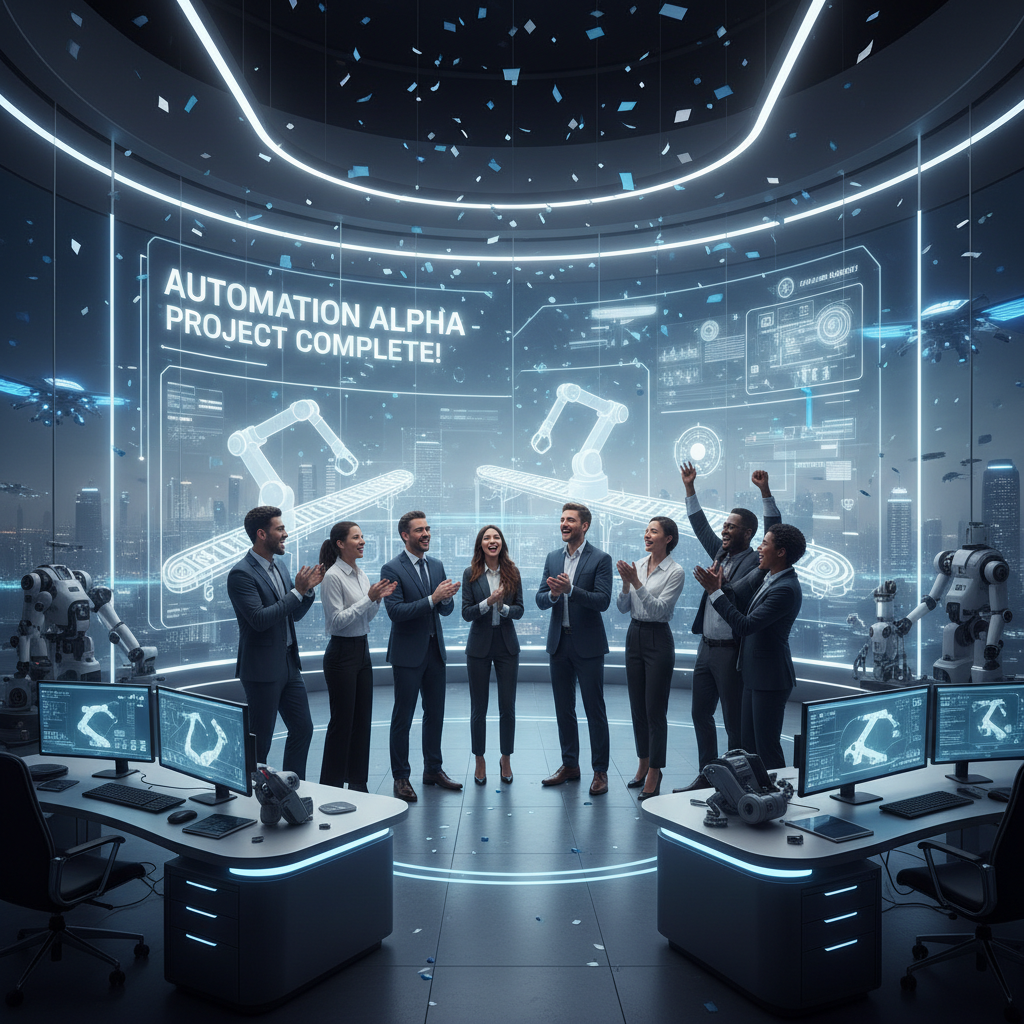 Alt text: Diverse team celebrating automation breakthrough, with digital interfaces, highlighting operational success.