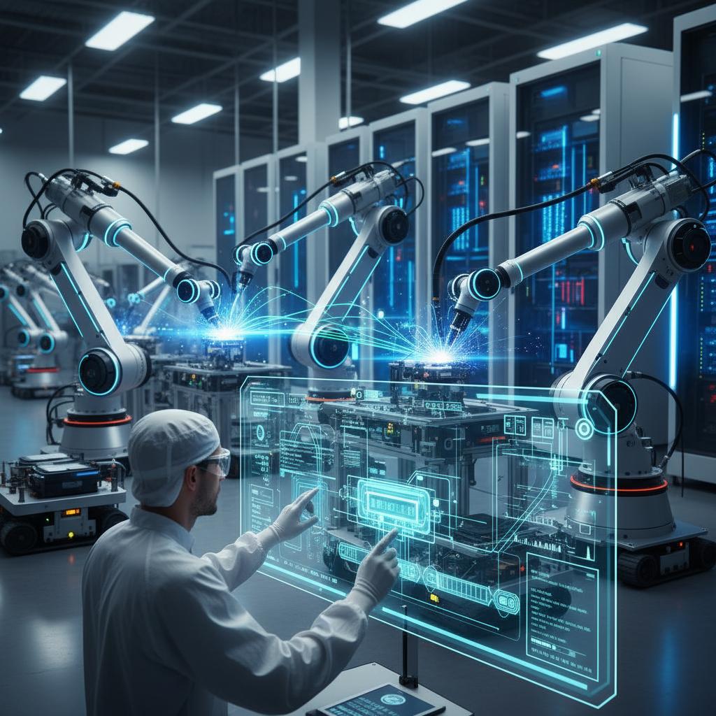Photo of a modern factory floor with robots and human workers collaborating, illustrating the blend of automation and human expertise.