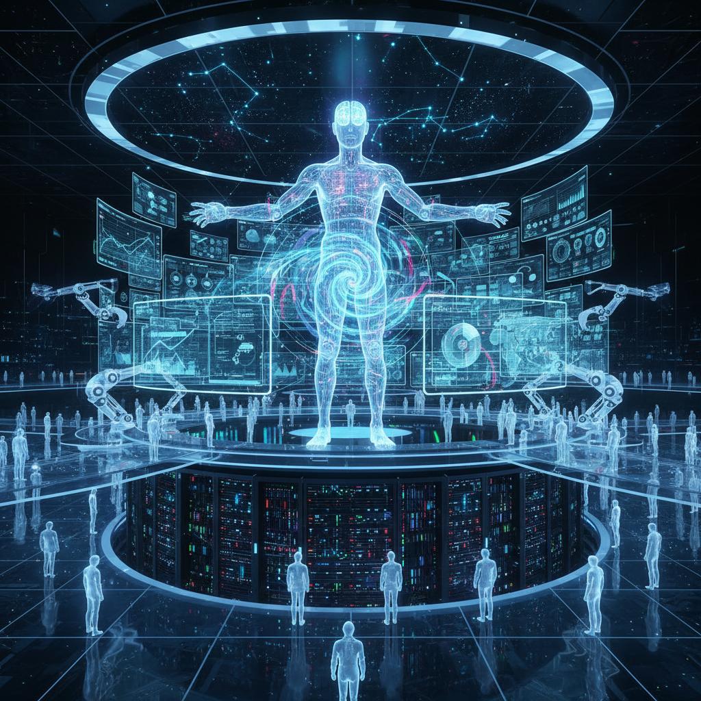 Alt text: AI orchestrating complex project workflows in a digital hub, illustrating the future of autonomous project management.