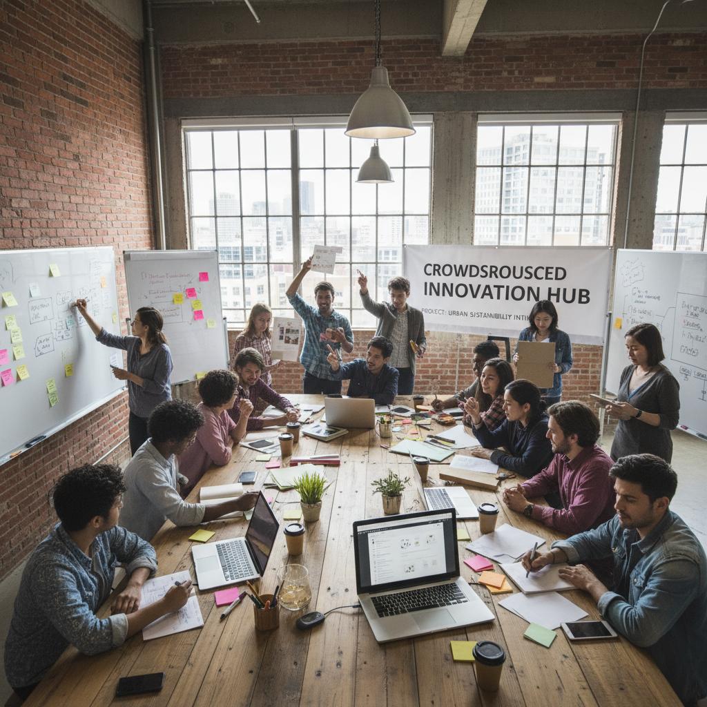 Alt text: Crowdsourced project team ideation session, with a diverse group brainstorming using digital boards, symbolizing open innovation in project management.