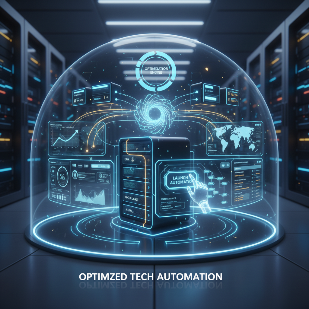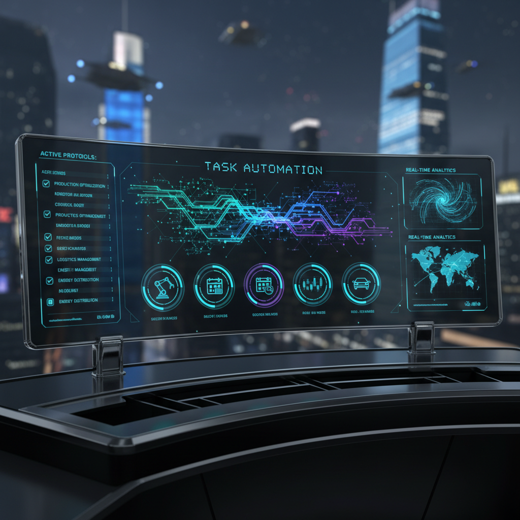 Image: Futuristic AI dashboard optimizing tasks; alt: AI-powered automation interface