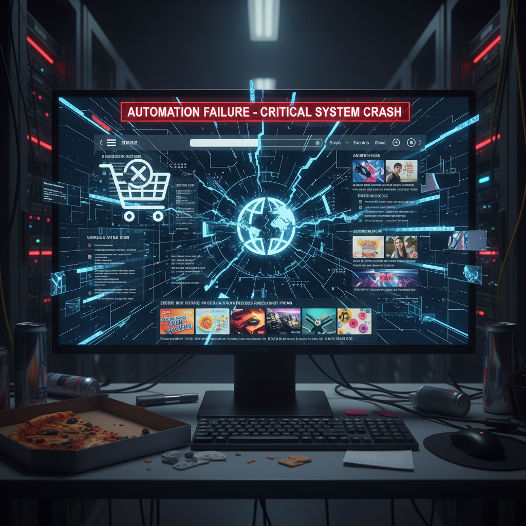 Alt text: E-commerce automation gone wrong, crashed storefront with digital error messages