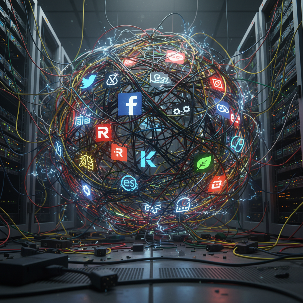 Alt: Tangle of branded software wires symbolizing real-world integration headaches and task automation software comparison