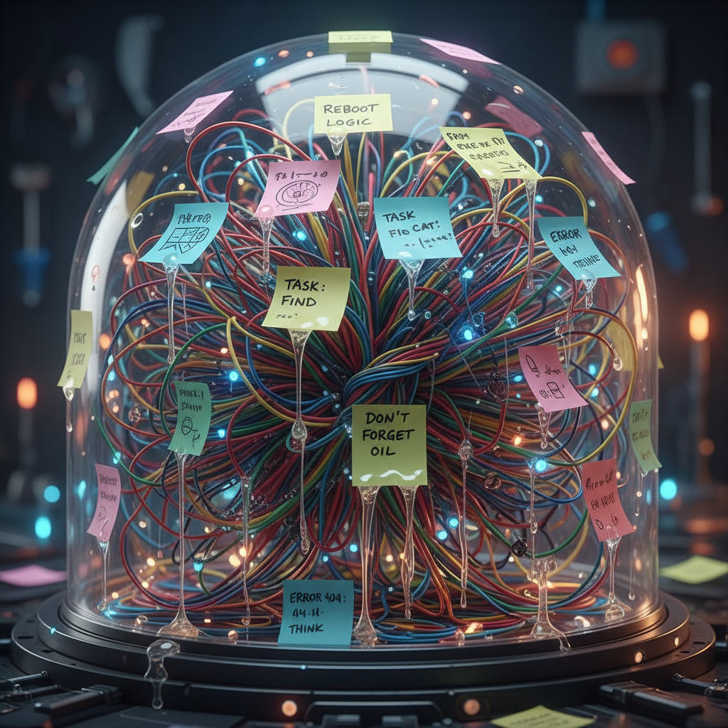 Alt text: Symbolic photo of a robot brain with tangled wires and sticky notes, representing AI-powered task automation software versus manual processes.